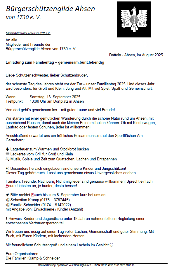 Wir hoffen auf rege Beteiligung durch unsere Schützenbrüder und Schützenschwestern.